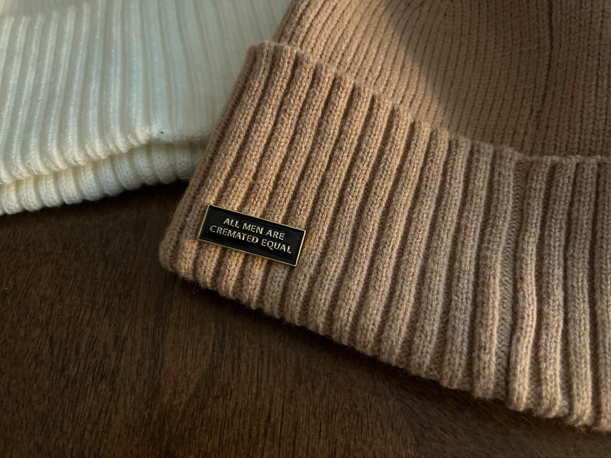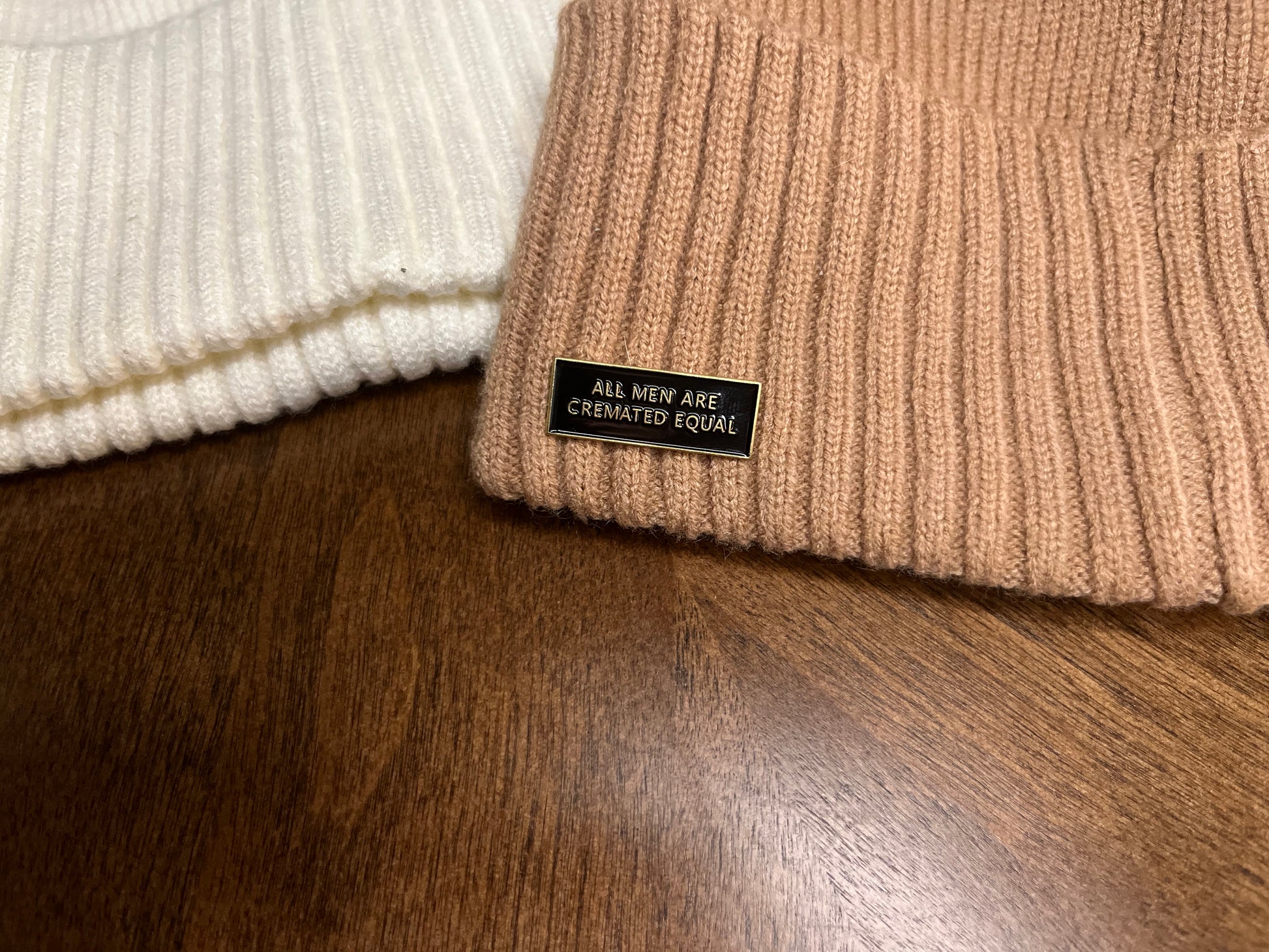 Unleash your rebellious side with Cremated Equal, a pin that makes a statement. Featuring a black background and bold gold lettering, it declares that all men are equal (in ashes). Show off your unique style with this playful accessory!