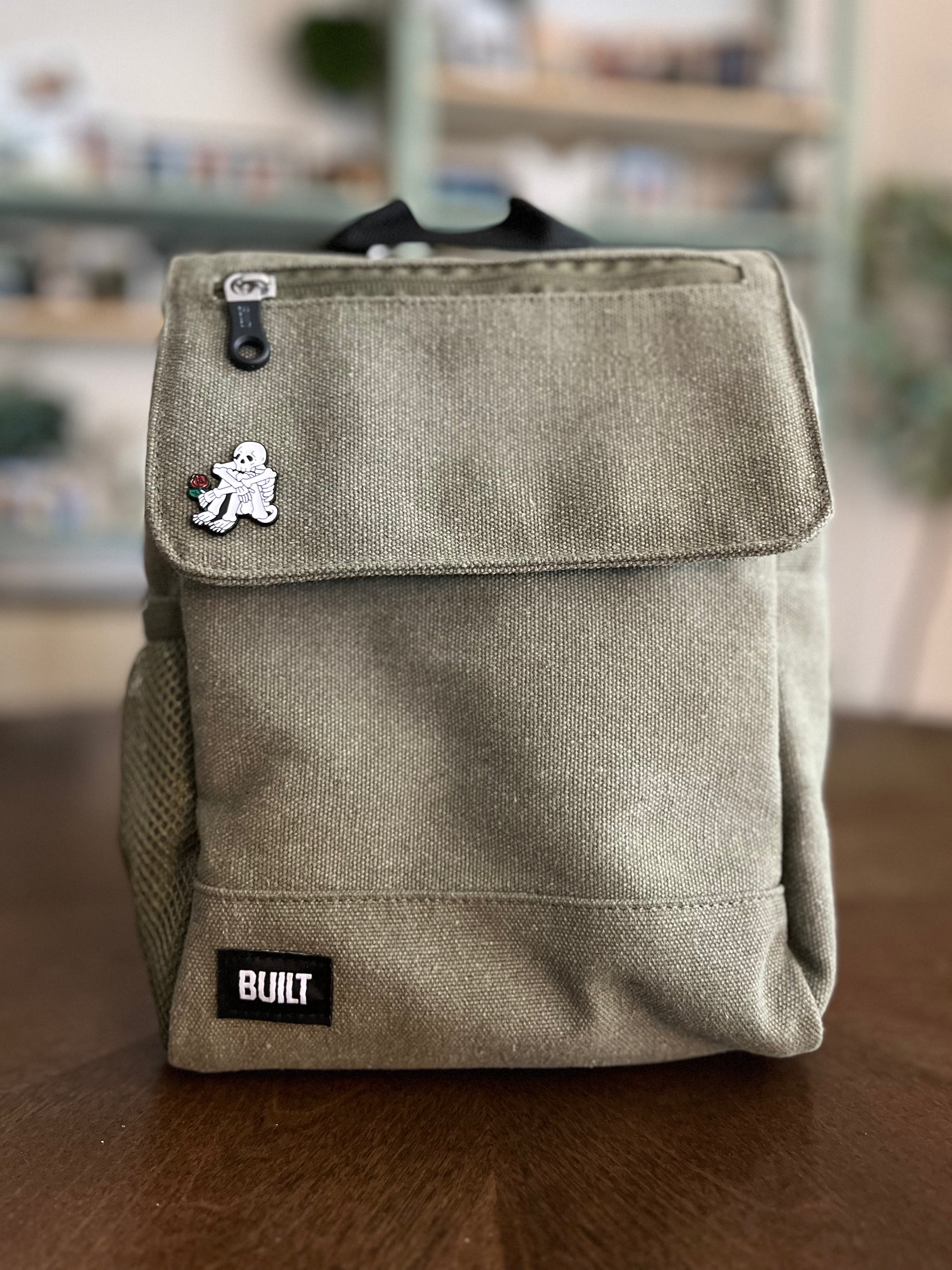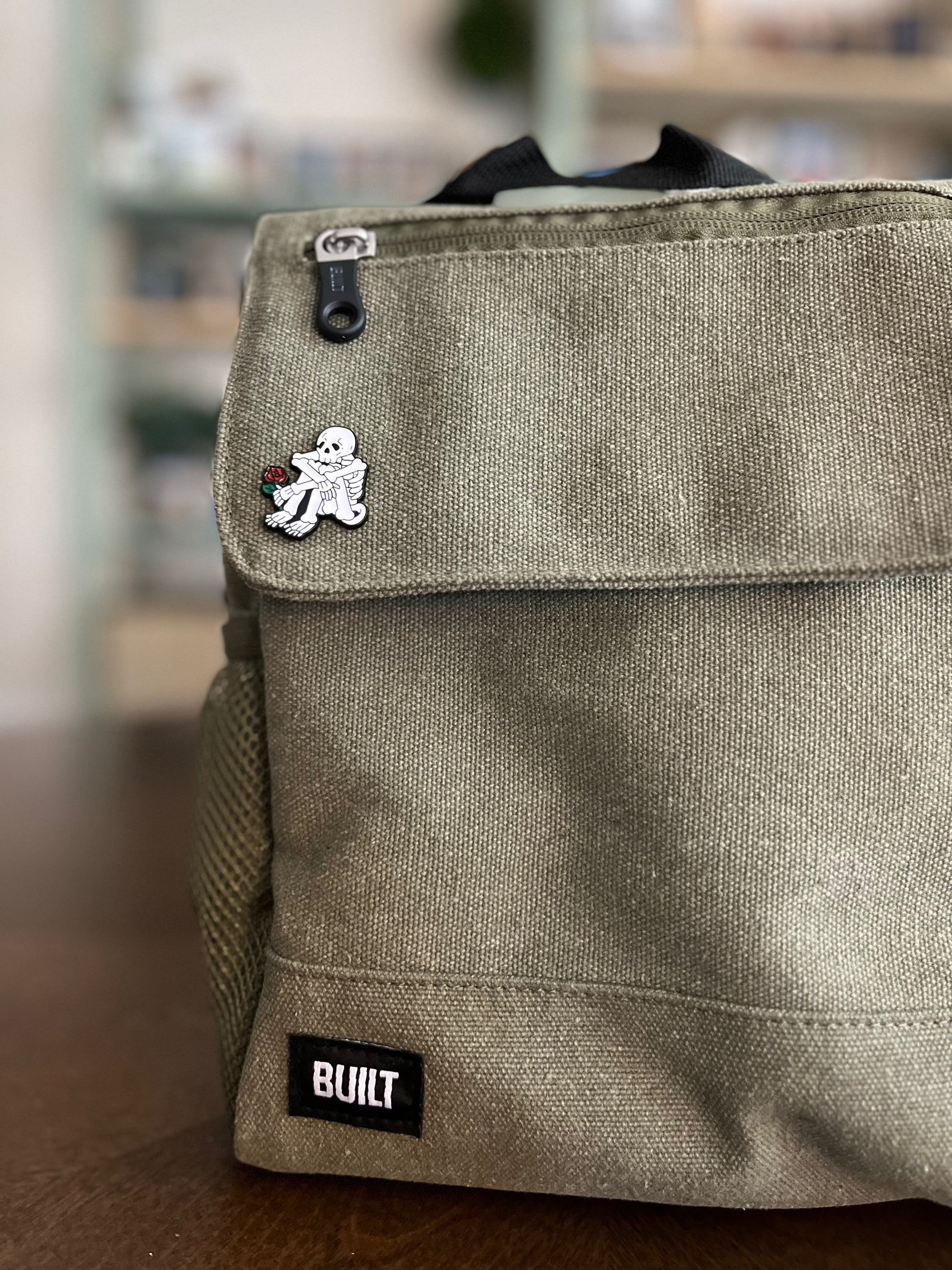 Add a touch of dark humor to your outfit with the Sad Skeleton pin. This quirky pin features a melancholic skeleton holding a rose in its hand, perfect for those who don't take themselves too seriously. Express your inner emo with this unique accessory.
