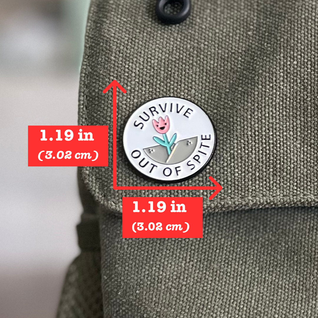 Embrace your resilience with Survive Out Of Spite. This playful circle pin features a cute flower and the empowering words to keep going, no matter what. Wear it as a reminder to never give up, or gift it to someone who needs a little pick-me-up.